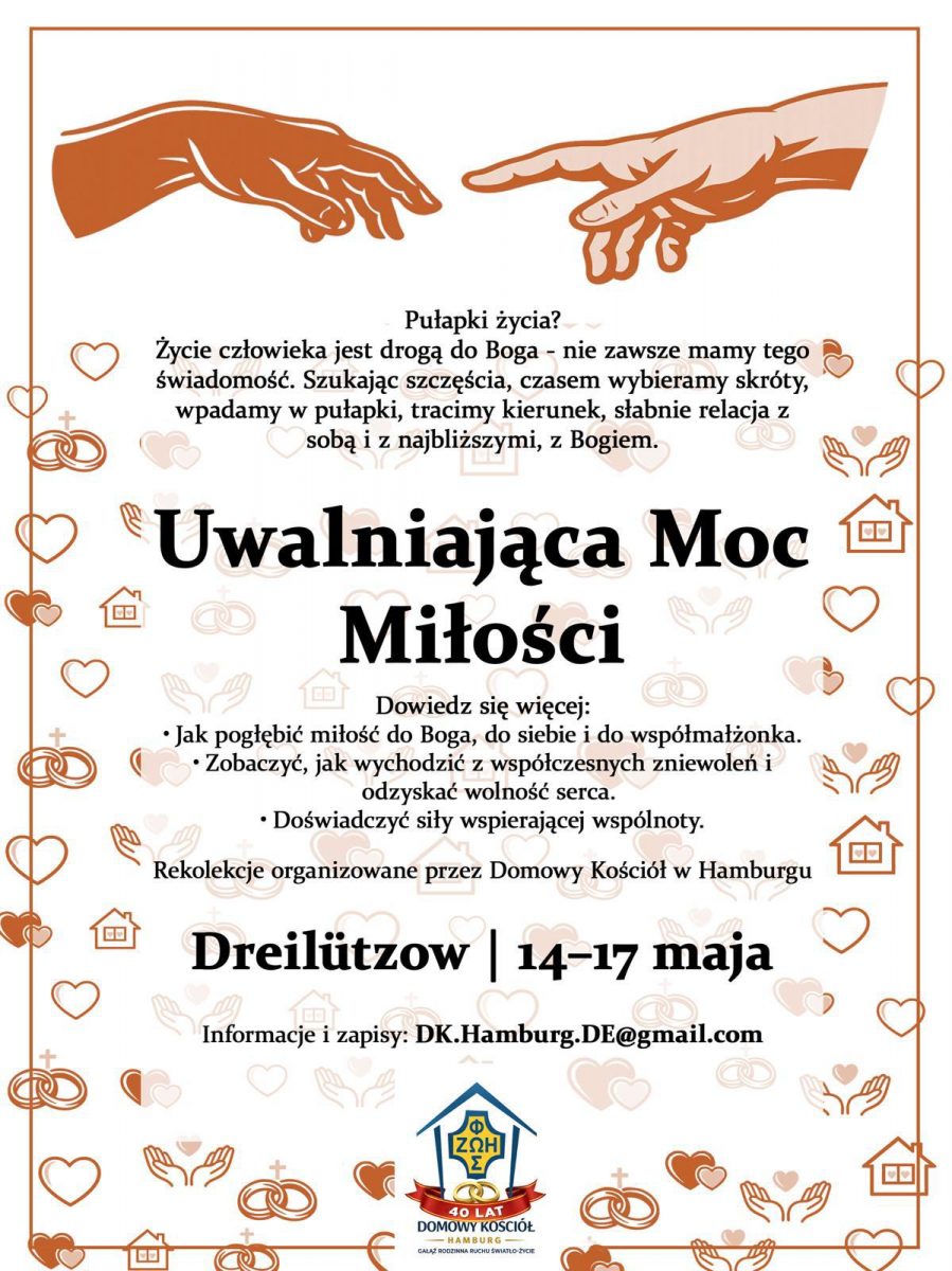 Zapraszamy na Oazę Rekolekcyjną Animatorów Rodzin II stopnia w Centrum Ruchu Światło Życie w Carlsbergu w maju 2024. Zapisy do 31.12.2023 pod adresem parakrajowa@domowykosciol.de. Koszt
